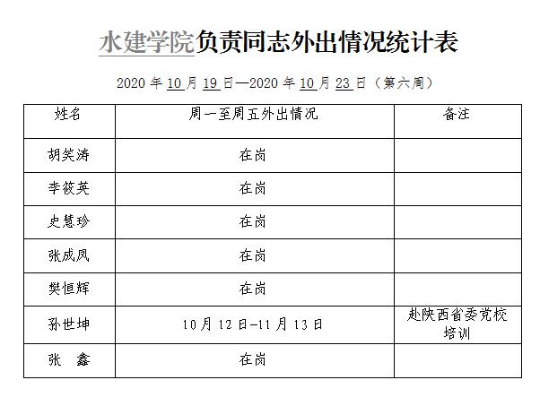 水建学院负责同志外出情况统计表(第六周)