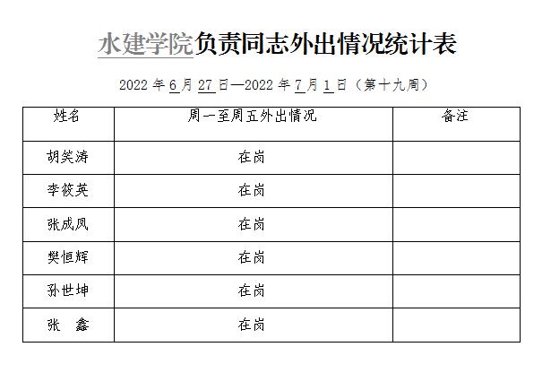 水建学院负责同志外出情况统计表(第十九周)