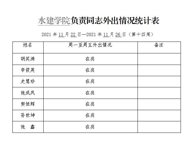 水建学院负责同志外出情况统计表(第十四周)