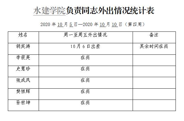 水建学院负责同志外出情况统计表(第四周)