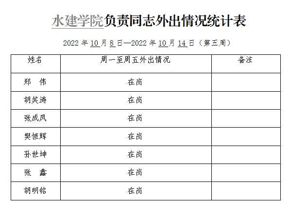 水建学院负责同志外出情况统计表(第五周)