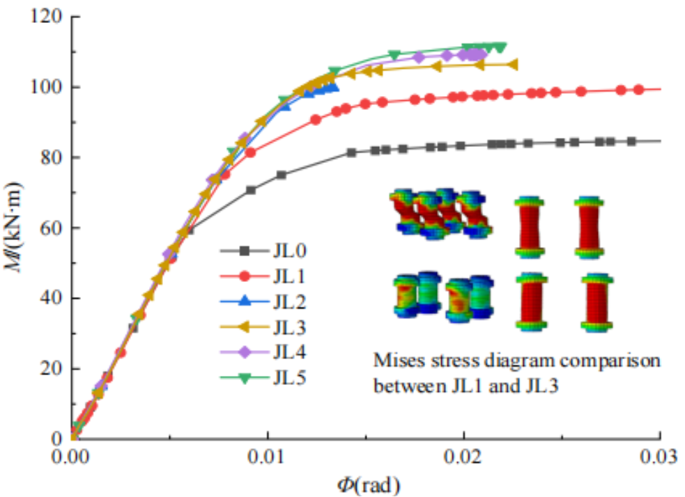 板柱型节点(PCJ)是一种典型的半刚性节点,是由传统的板式节点改进而来,具有更大的弯曲刚度。然而,该节点的几何参数对其弯曲刚度以及半刚接网壳稳定性的影响尚未得到充分研究。因此,本文通过建立精细化有限元模型(见图1),首先研究了盖板厚度和螺栓直径以及螺栓形式对节点弯曲刚度的影响(见图2);然后,提出了一种改进的双线性模型,通过多元回归分析获得了双线性模型的刚度系数、初始刚度和屈服弯矩的拟合公式;最后,建立了板柱型节点柱面网壳有限元模型,研究了盖板厚度对不同跨度和矢跨比的单层柱面网壳承载力的影响规律。