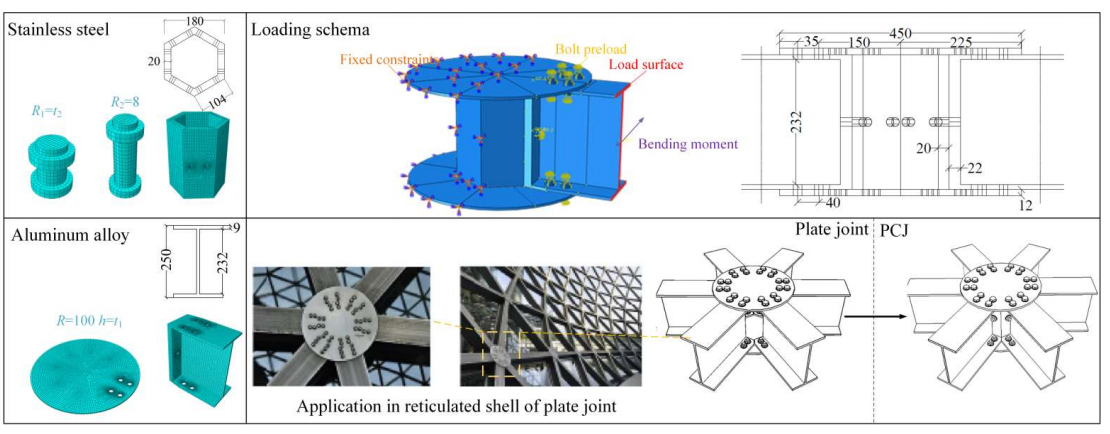 研究表明,盖板厚度和螺栓半径越小,网壳的承载力越小。当盖板厚度小于4毫米时,弯曲刚度显著下降。因此,本文建议盖板厚度推荐取为4~6毫米,以节省用钢量。此外,板柱型节点的弯曲刚度对其网壳的极限承载能力和破坏模式有显著影响,在进行该类节点设计时应充分考虑上述因素。