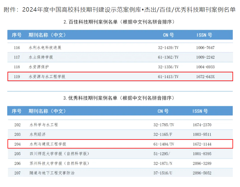 2024年12月3日中国高校科技期刊研究会公布了2024年度中国高校科技期刊建设示范案例库?杰出/百佳/优秀科技期刊案例名单,我院期刊部《水资源与水工程学报》入选“百佳科技期刊”,《水利与建筑工程学报》入选 “优秀科技期刊”。