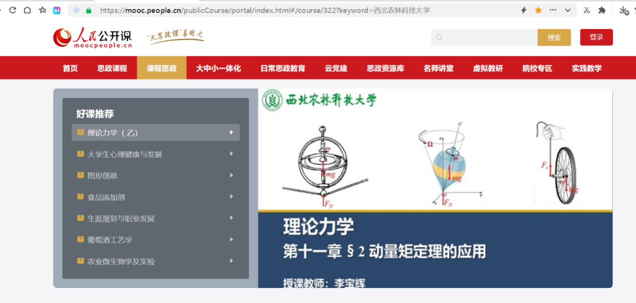 近日,经专家审核、西北农林科技大学教发中心推荐,由水利与建筑工程学院教师李宝辉讲授的《理论力学》(乙)课程思政教学案例——动量矩定理的应用,在文华在线-人民公开课-大思政课MOOC平台上线。