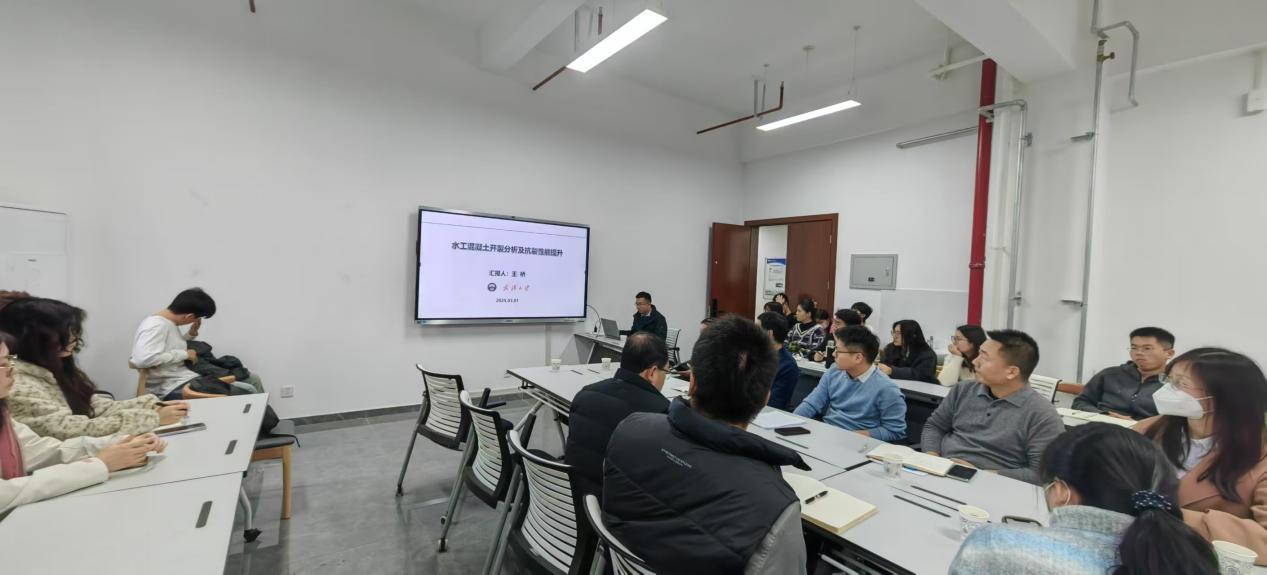 王桥副教授以水工混凝土开裂问题为切入点,详细介绍了其采用相场法实现的水工混凝土耦合开裂问题的理论模型、程序研制和仿真模拟,并提出了开裂过程的网格自适应解决办法,最后讲解了其研制的抗裂性能提升新材料,引发了与会师生的热烈讨论。