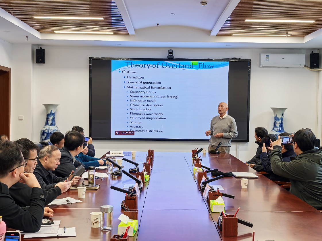 报告会上,Singh教授围绕地表漫流,从以下三个方面进行了探讨:(1)地表漫流的定义、分类和产流机制;(2)从流体力学和数学角度重新审视了地表漫流的运动波概念,根据地表漫流问题的分类以及暴雨运动方向、速度和覆盖范围的影响,发展了相应的模拟地表漫流的数学公式;(3)深入剖析了运动波理论,运动波概念的有效性、运动波方程的简化、精度及误差方程。